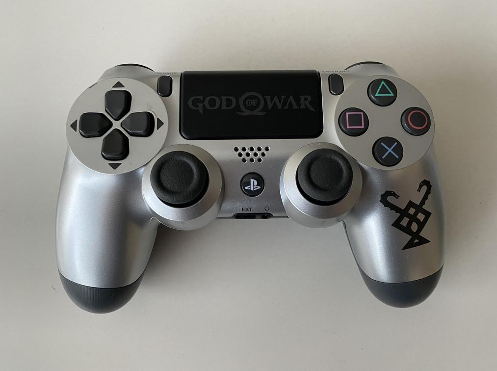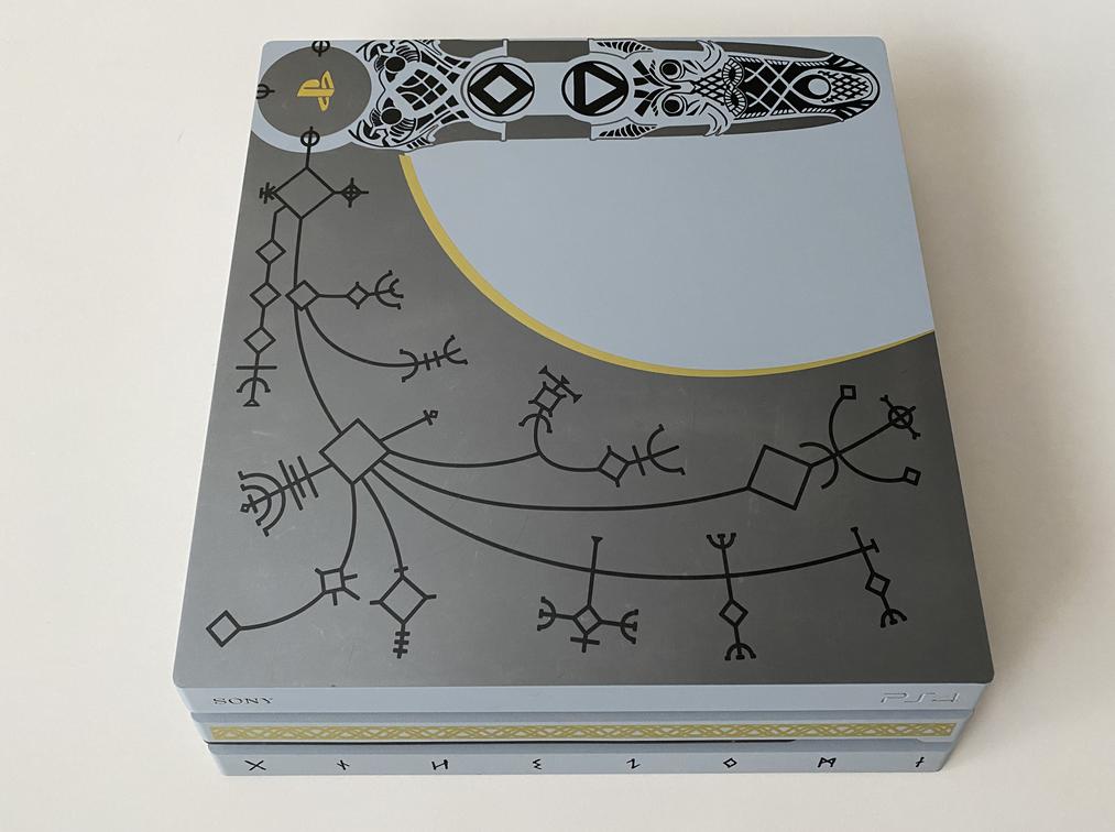 The item is in overall good condition. It includes the console, controller, God of War game, charging cable, HDMI cable and power cable. There are light scratches to the top of the console and light signs of wear to the bottom of the controller. There are no other signs of wear to the item.